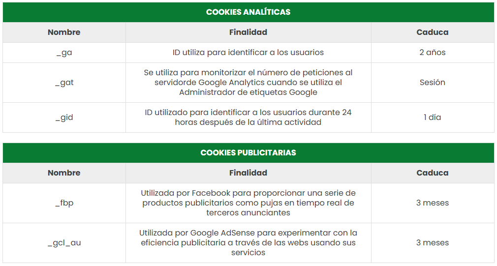 - Cookies Analíticas: Son cookies que tienen por finalidad el mantenimiento periódico y garantizar el mejor funcionamiento y servicio al usuario; recopilando datos de tu actividad.